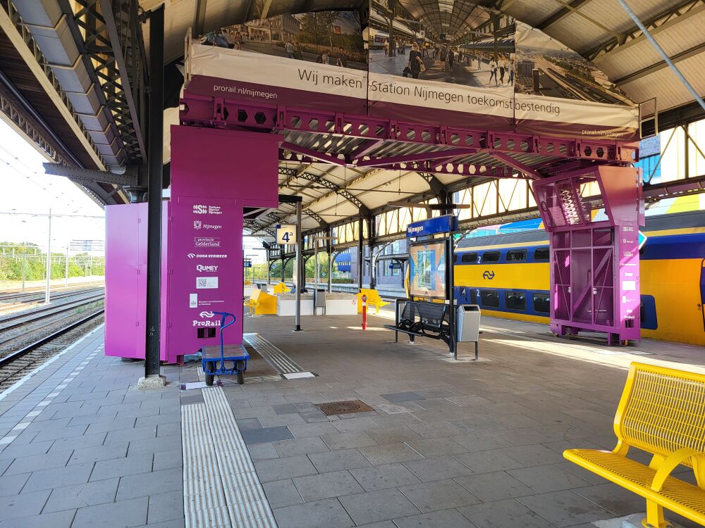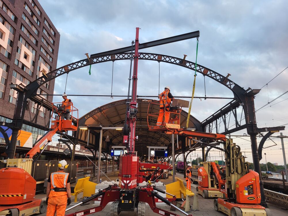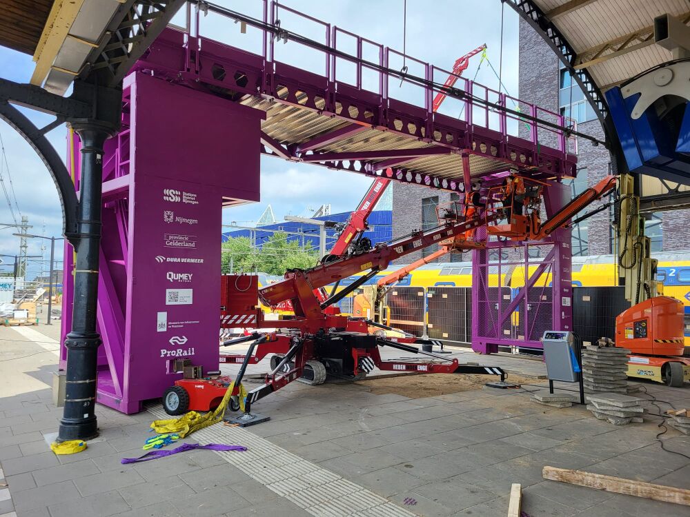 In Nijmegen werken wij als partner binnen het project PHS Nijmegen aan het behoud en de vernieuwing van de historische perronkappen bij perron 3-4. Met behulp van onze speciaal ontwikkelde werkwagen verwijderen we zorgvuldig de klinknagels en brengen we tijdelijke werkbouten aan. Hierdoor kunnen de perronkappen veilig, gecontroleerd en efficiënt worden gedemonteerd.