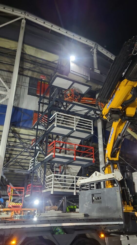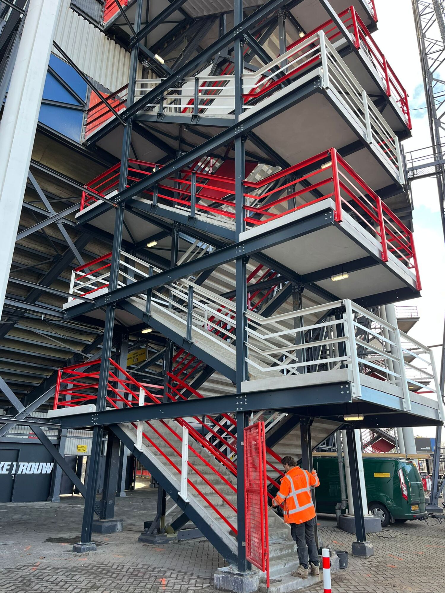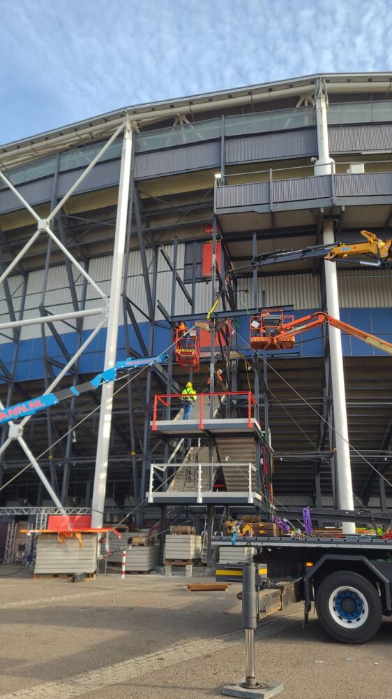 Het trappenhuis vormt een constructief onderdeel van de hoofddraagconstructie van het stadion. Dat vroeg om uiterste precisie en zorgvuldige engineering. Tijdens de werkzaamheden zijn onder andere trektuien met ballast toegepast en zijn belastingen en maatvoering continu gemonitord om de veiligheid te allen tijde te garanderen.
